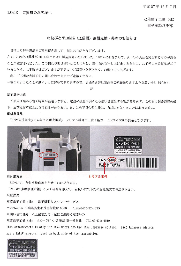 サポートお詫びとT18MZ(送信機)無償点検・修理のお知らせ(for Japanese User) (2015/12/07)