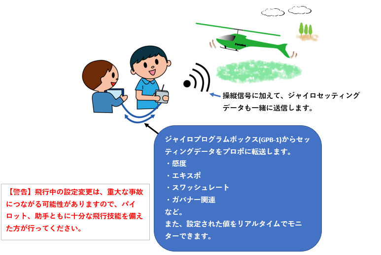 ヘリコプター用ジャイロのワイヤレスセッティングを、調整機能を搭載したプロポのメニューや、専用セッティングボックスをプロポに接続することで行うことができます。これにより、設定値の調整の際にわざわざ機体を着陸させキャノピーを外してトリマーを調整したり、エンジン機の場合は着陸後に一度エンジンを止めたり、設定用ケーブルを接続するなどの煩わしい作業から開放されます。