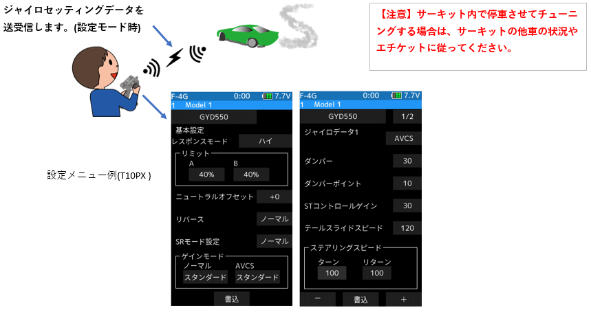 ワイヤレスでのセッティングができることにより、セッティング変更毎に車体をピットに戻したり、ボディーを外したりする手間から開放されるとともに、直前のドライビング感覚が失われる前に即座に設定変更の比較が行えます。 (対応機種:GYD550 ('2023/10現在))