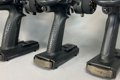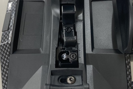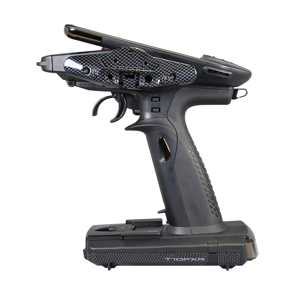 送信機の内部構成、配置、重量配分の見直しにより、バランス良いグリップフィーリングで操作性を向上。特にLCD固定ブラケットの材質をガラス繊維入り強化樹脂(GF)に変更し、軽量化と最適重量配分に加え、剛性アップも実現。